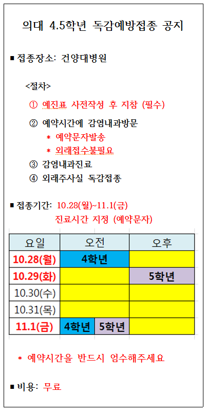 | 제목 | 의학과4,5학년 인플루엔자 예방접종(무료) 안내 | ||||